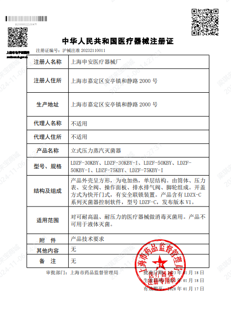 本品為醫療器械產品,屬于壓力容器受控產品,符合壓力容器設計與制作的相關規定,并取得了食藥監產品注冊證和消毒產品衛生許可證,是我廠研制開發的新一代智能型立式壓力蒸汽滅菌器,具有快捷簡便的操作方式和功能齊全的控制系統,在安全控制上;具有超壓自泄、斷水保護、超溫自控的數套安全聯鎖的裝置。本品操作系統采用微機自動處理技術,滅菌運行過程實行微機自動控制,操控臺上的液晶顯示窗顯示整個滅菌動態和功能運行情況,產品主要部件采用不銹鋼材料精制而成,滅菌指標達到醫用手術級標準,是供醫療機構對可耐壓力、耐高溫蒸汽的醫療器械或衛生用品進行滅菌或消毒的理想產品。